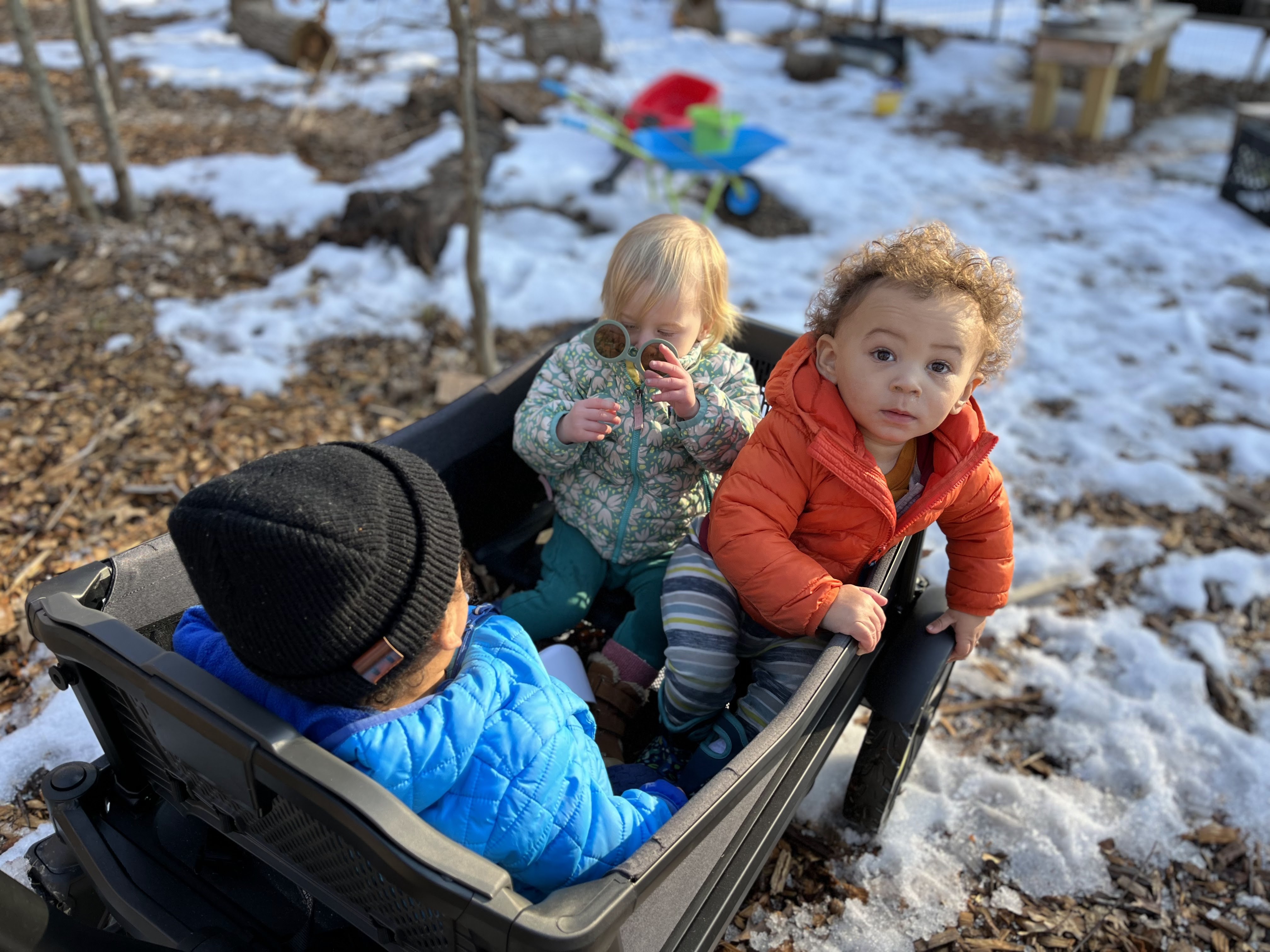 Upon arrival you are invited to accompany your child to the Knoll, where we begin our day with nature play. This is a time for the children to play and explore whatever interests them: building with log blocks, playing in the mud kitchen, climbing on the slide and hay bales, digging in the dirt, gardening, etc. It is a time for the teachers to observe what is engaging each child, and to find ways of inviting them into deeper relationships with each other and the natural world. After nature play, we gather together for song, story, and an organic homemade snack (either on the Knoll or in the Nest, weather depending). After snack and toileting, we head up the Mountain for a nature adventure, traveling up on foot or wagon, and encountering the plant, insect, bird, and animal life. We return to end the day with lunch together.